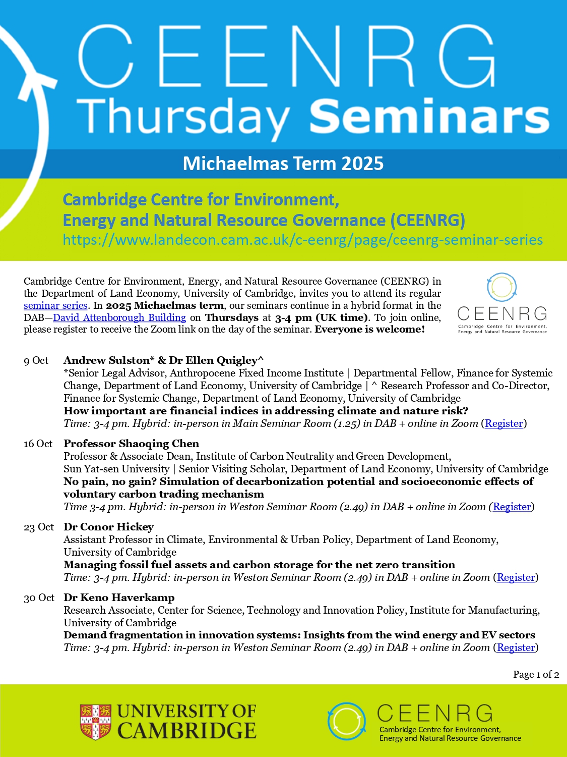 英國劍橋大學環境、能源與自然資源治理中心 (Centre for Environment, Energy and Natural Resource Governance, C-EENRG) 2025 Michaelmas 學期學術研討課